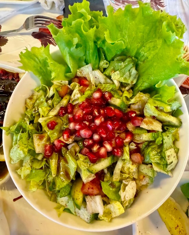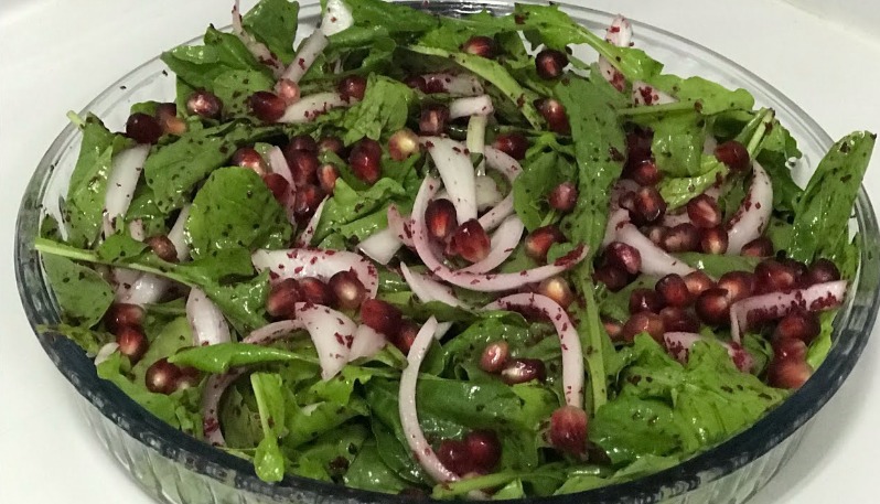 سلطة جرجير طازجة مع شرائح البصل الأحمر، عصير الليمون، ودبس الرمان