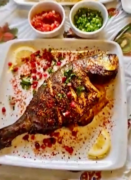 سمك طازج بالفرن مع طبق الارز والسيرفيس
