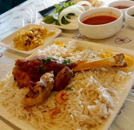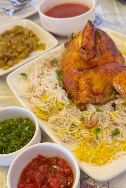 كبسة روبيان مع الأرز البسمتي والبهارات الخاصة، تقدم مع أطباق جانبية
