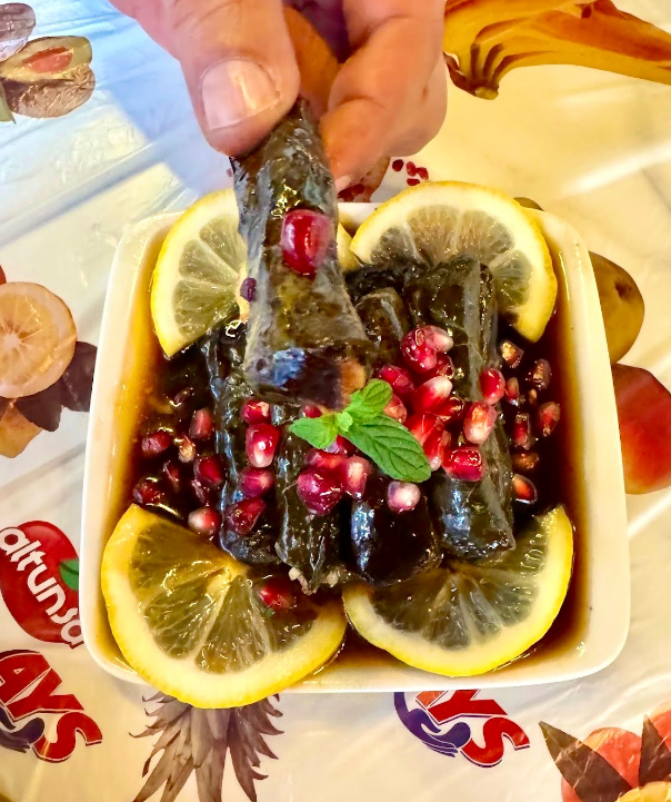 ورق عنب طازج محشي بالأرز واللحم المفروم، مع صلصة الليمون الحامضة ودبس الرمان الحلو المميز