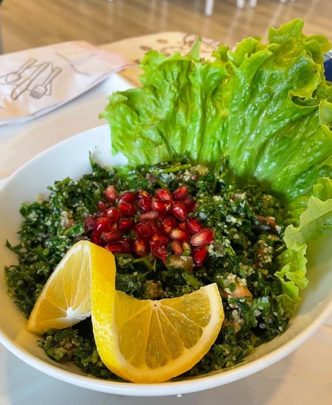 سلطة التبولة التقليدية مع البقدونس، الليمون، البرغل الناعم، وشرائح الرمان